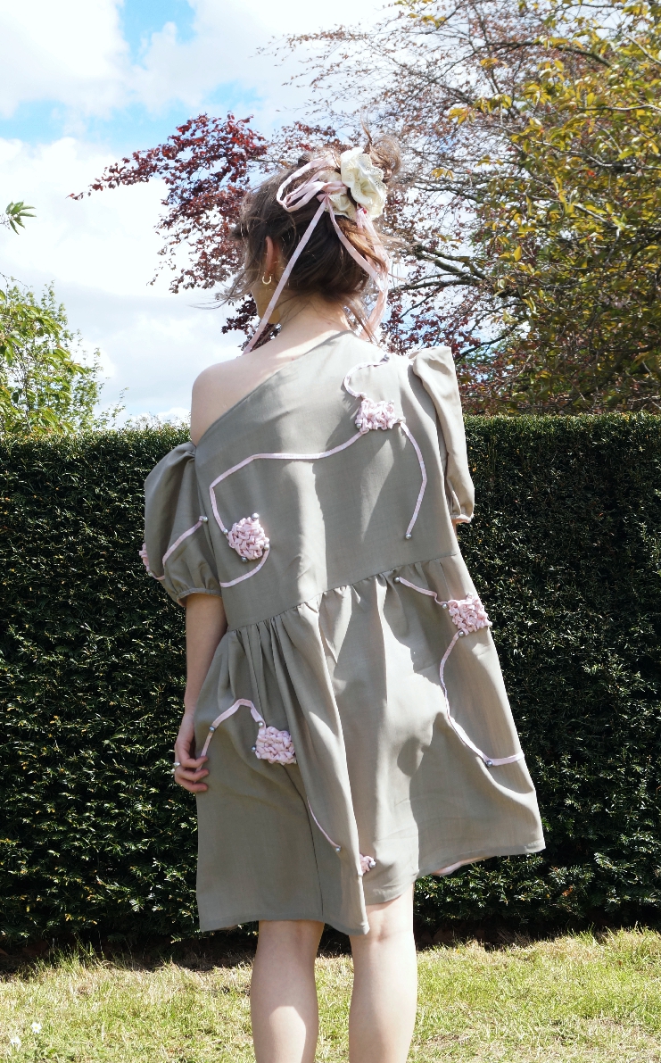 This one-of-a-kind dress is part of our limited edition The Luxe capsule collection. Each dress is made from repurposed textiles, giving them a new lease on life. This particular dress is made from curtains and a duvet cover, and features an unique asymmetrical neckline and puff sleeves.